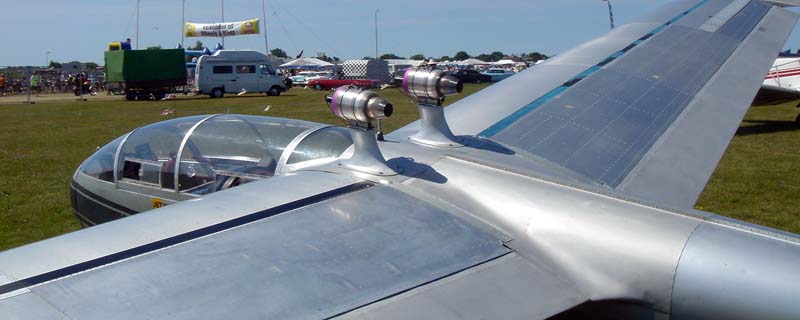 | But the weirdest aircraft of the show is this Blanik glider with ... two jet engines! Mind you, it burns 0.7 liter fuel per minute and needs 3,000 ft asphalt runway to take off so ... it's only an experiment. |