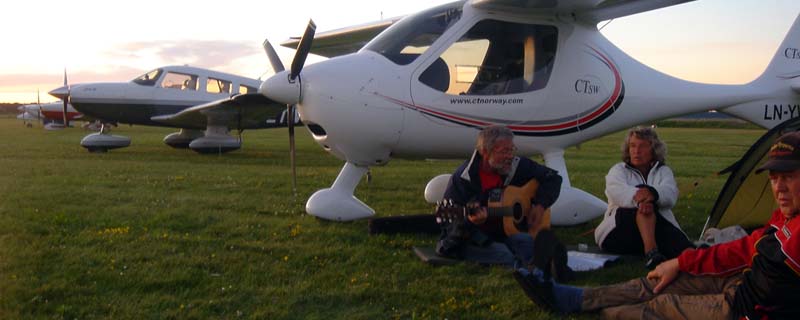 | Happiness is good friends and a guitar. Here, Arne, Elisabeth and Odd-Tore. Arne's CT flies about twice as fast as my Kitfox! On the other hand, I enjoy twice as long to be in the air. :-) |
