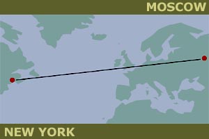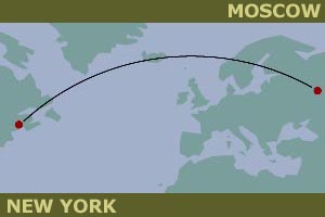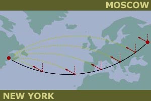 Allow me to work an example: We will be flying from Moscow to New York. 1) The great circle navigation. Imagine that there was a powerful radio station in New York, you can take a bearing on. Because radio waves follow the shortest path, it will lead you to the shortest route. This is the homing quality of radio. This route will take you over Norway and Iceland. Your heading will constantly change, as you cross the meridians at different angles. |