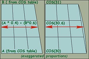 | One way of calculating this, without putting more load on the processor time, would be to use a look-up table of cosine functions for each degree, then interpolate it in a linear way, in between. Yes, because the "trapezoid" seen in X-Plane maps doesn't have a straight side edge, it is in fact a curve. But if this curve could be seen as a straight line, calculation could be executed so much faster. It would, of course, result in a slight error but not more than a few meters. I think we could live with that, considering that the error would be only absolute, and not relative. If all calculations were done using the same model, ILS, runways, VOR, etc would align perfectly. |
