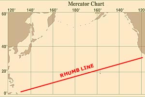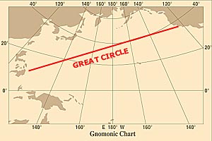 | From this we can conclude: what is the correct distance measurement on the surface of the globe? The great circle? Yes, because it is the shortest route and the one any navigator would opt for. But unless you home on a radio beacon, the great circle has to be computed for you, either by ... a computer, or with the help of a special gnomonic chart. |