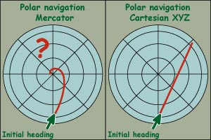 | However, there is still something that a Mercator projection cannot do for us, namely, polar navigation! Because of its parallel meridians, the Mercator projection meets a limit at the poles. If we want to fly over the poles, we need another system, which is the model that takes the centre of the earth as an origin. This is commonly called the "round earth model" and is what is used in some other simulators. |