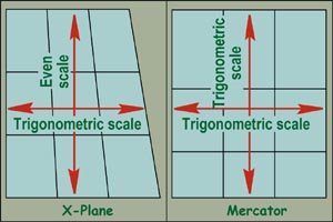| As you have all experienced, the maps shown in X-Plane have a wedge on the side. This is to account for the narrowing of the meridians toward the poles. X-Plane calculates position as a constant Y-scale (the latitudes) and a varying X-scale (the longitudes). One solution would then be to use the Mercator projection that gives rectangular "tiles" of degrees of latitude and longitude. But it would mean that each latitude must be calculated to its own scale, thus involving another trigonometric calculation. This is possible and it would eliminate the existing error encountered when e.g. trying to align the localiser of an ILS. |