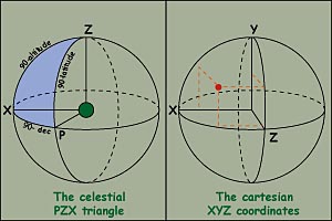 | There is two ways of calculating a position and a route in the round world model, the solving of the spherical PZX triangle - familiar to all astro-navigators - and the linear XYZ model. The former is out of question because it requires too much computer processing time. The latter is the one used, hopefully without too much affect on the processing time, and resulting frame-rate. However this doesn't solve all the problems. Routes of different natures still have to be corrected for what they are in the real world. |