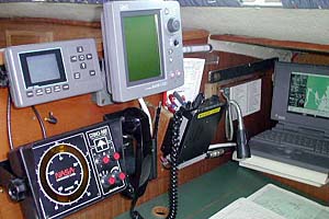 Mogador (wife #2) instrument panel. The GPS, echo sounder, radar, VHF, and to the right, the Mac PowerBook running my navigation software.