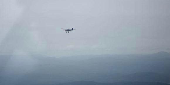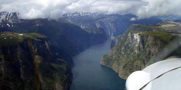 A few days later, the weather breaks just enough for the Storch to come to Førde-Bringeland, its destination. Here is the beautiful Sogn fjord. Quelques jours plus tard, une fenêtre dans la météo permet au Storch d'arriver jusqu'à sa destination finale, Førde-Bringeland. Ici il survole le magnifique fjord de Sogn.