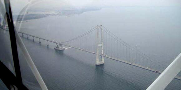 Here we pass over the Storebelt bridge between the islands of Fyn and Sjælland in Denmark. Ici nous survolons le pont du Storebelt entre les îles de Fyn et Sjælland au Danemark.
